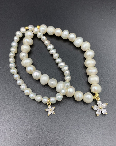 Náramok perlový s veľkou... Cena 35,00 € pravé riečne perly 5-6 mm prívesok veľká ružička so zirkónmi pomocné korálky pozlátené striebro Nakupuj
