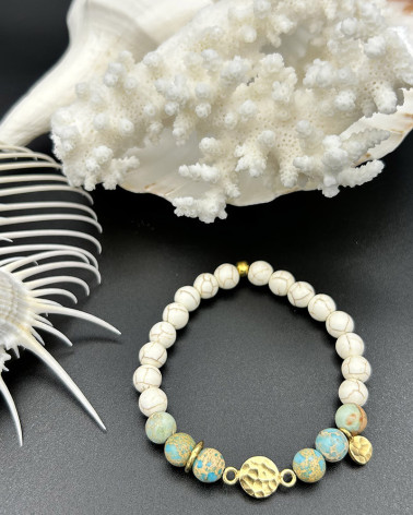 Náramok Sardínia tyrkenit a... Cena 33,00 € korálky béžového tyrkenitu 8 mm korálky pravého jaspisu regalitu tyrkysového komponenty z pozláteného striebra Nakupuj