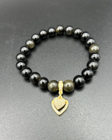 Náramok obsidián so srdcom... Cena 49,00 € korálky zlatý obsidián 6 mm stredový diel prívesok srdce bižu vo farbe striebra so zirkónmi Nakupuj
