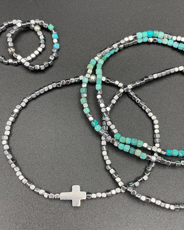 Náhrdelník hematit s tyrkysom Cena 54,00 € korálky hematitu mini kocky korálky pravého tyrkysu mini kocky dá sa nosiť aj ako náramok (2 obtočenia) Nakupuj