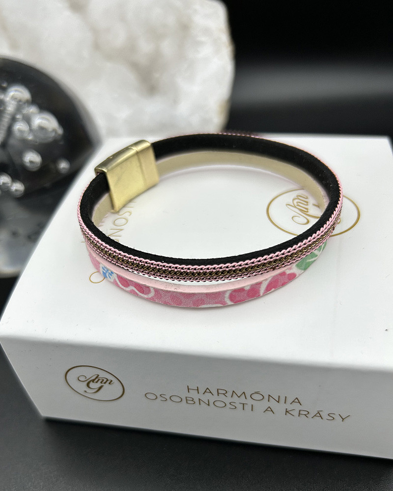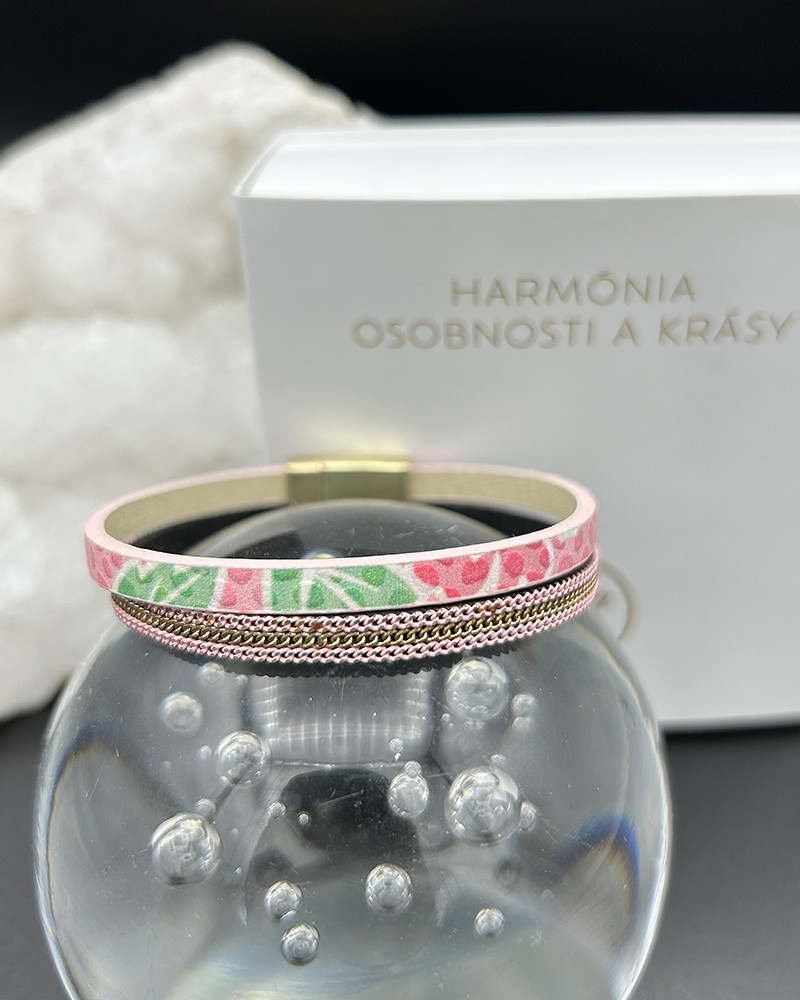 Náramok z ekokože ružovo kvietkový s retiazkou
