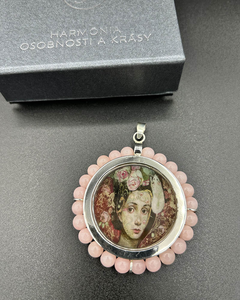prívesok z rodiovaného striebra stredný kruh s miniatúrou diela Kataríny Vavrovej: „Chvála zvedavosti“